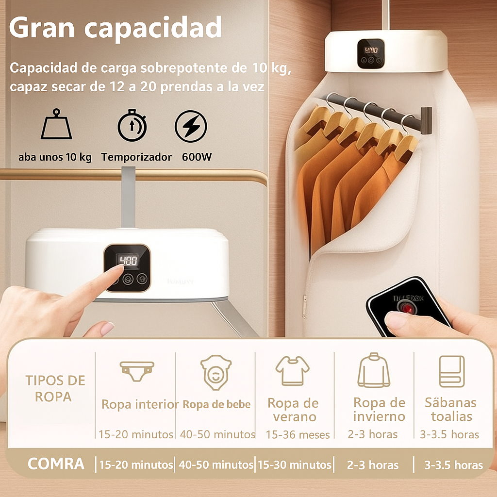 Seca tus prendas de forma rápida, silenciosa y sin ocupar espacio. Su diseño compacto y su potente sistema de calor hacen que sea perfecta para apartamentos, viajes o días lluviosos. ¡Olvídate de la espera y ten tu ropa lista en poco tiempo!